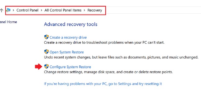 Control Panel > All Control Panel Items > Recovery > Configure System Restore