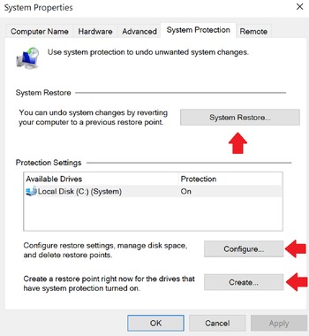 Configure: Allows you set up system restore settings and configure routine restore points that can be confined by drive space. If you are looking to set up regularly occurring restore points or change how much resources you have allocated, use the Configure button.