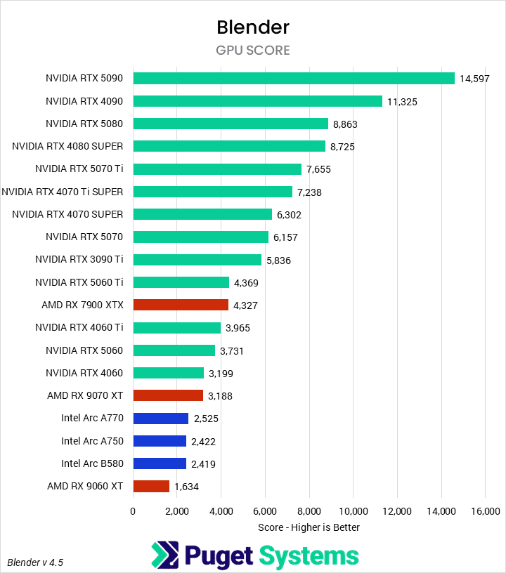 Unfortunately, GPUs other than NVIDIA’s are relatively unsupported in most offline renderers. Of the four we routinely test, only Blender has implemented support for Intel and modern AMD cards. Even with Blender (Chart #1), though, we found that NVIDIA dominates the chart. The GeForce RTX 5090 was 29% faster than the 4090. Curiously, though, the rest of the 50 Series cards essentially match their previous-gen counterparts. AMD first manages to make the chart with the Radeon RX 7900 XTX, sandwiched between the RTX 5060 Ti and 4060 Ti, while the remaining Radeon and Intel Arc cards make up the bottom 5 entries.