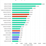 Bar chart of render score in the V-Ray benchmark using RTX.