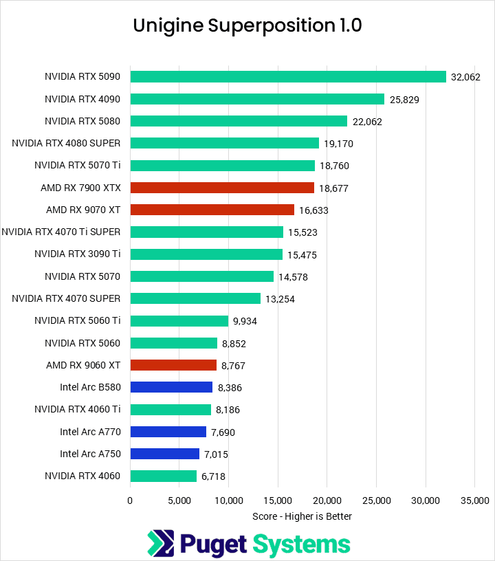 We also ran the Unigine Superposition 1.0 benchmark and, since we don’t have any other real-time renderers, decided to include it in this section. As expected, NVIDIA’s top-end GPUs performed very well, but we were surprised to see that both Intel and AMD’s cards did relatively better in this engine than in Unreal.