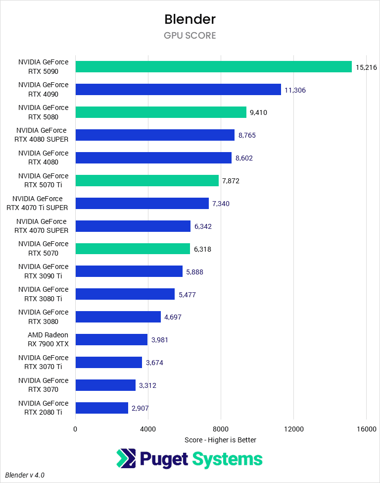 Currently, the fastest GPU for Blender is the NVIDIA GeForce RTX™ 5090. The other RTX 40 & 50 Series cards also perform quite well, though!
