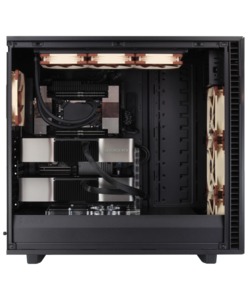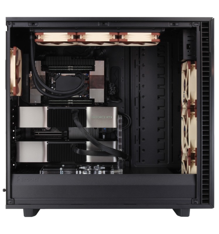 This system is built in the Fractal Design Define 7 XL, which has USB and audio ports along the top front edge. The motherboard’s rear I/O panel provides more USB ports, additional audio connectivity, and both 10Gb Ethernet and WiFi networking. With extra space in a chassis this large, a wide range of options are supported – including multiple video cards, up to 512GB of memory, and multiple solid-state and hard drive configurations. There are also plenty of fans to keep things cool, with filters over the air intakes to reduce dust buildup.