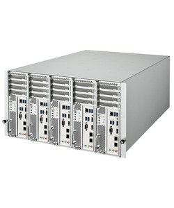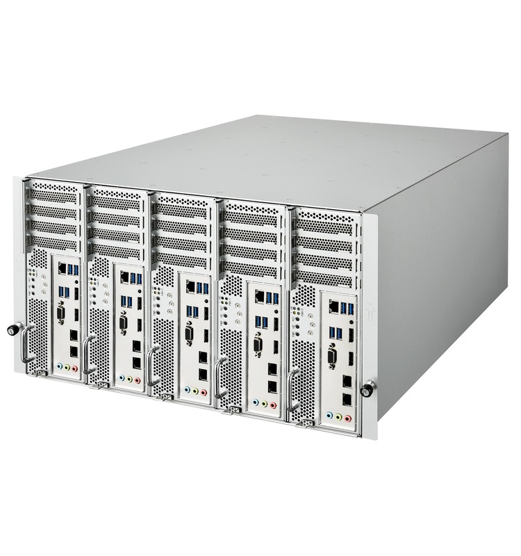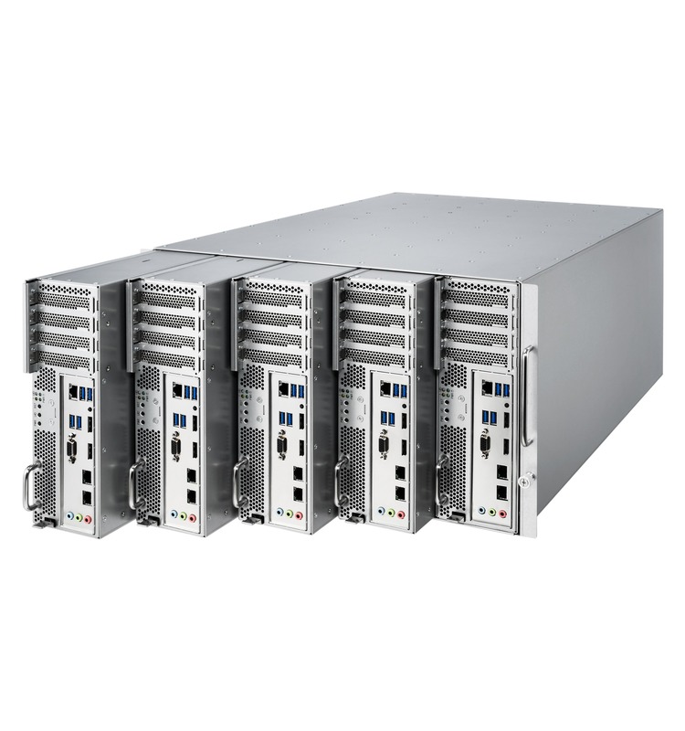 Remote workstation platform housing five separate nodes, each with an AMD Ryzen™ 9000 processor and desktop-class GPU, built into a 6U rackmount chassis.