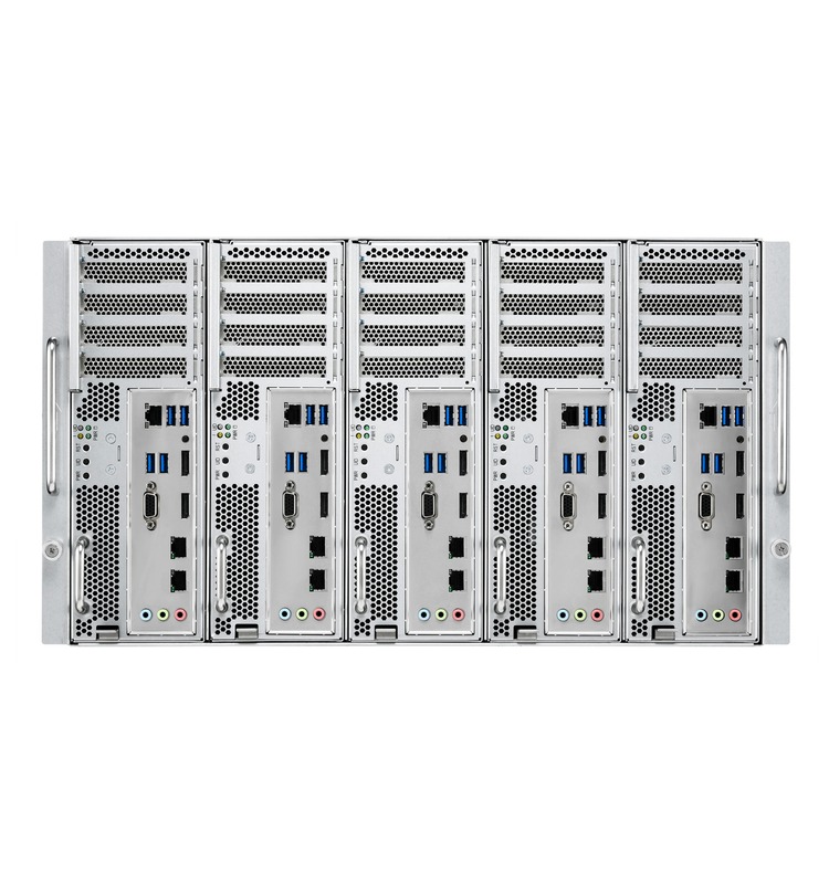 This entry in Puget Systems’ rackmount workstation line is rather unique. Built into a single 6U chassis are five independent system nodes, each running an AMD Ryzen or EPYC processor and full-size, desktop-class video card. That set of hardware makes this an ideal solution for housing multiple remote workstations, without the complexities of virtualization. It can also be a great solution for multi-screen installations, saving space compared to five desktop towers or even 2U / 3U size systems.