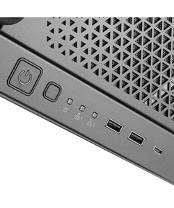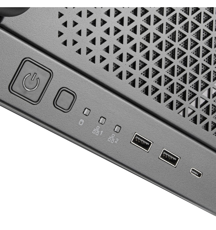This system is built in a convertible 5U chassis with two USB ports on the front and the bulk of the connectivity (more USB, audio, and networking) on the motherboard’s rear I/O panel. Internally, there is space for a wide range of options: multiple video cards, up to 512GB of memory, and a wide range of solid-state and hard drive configurations.