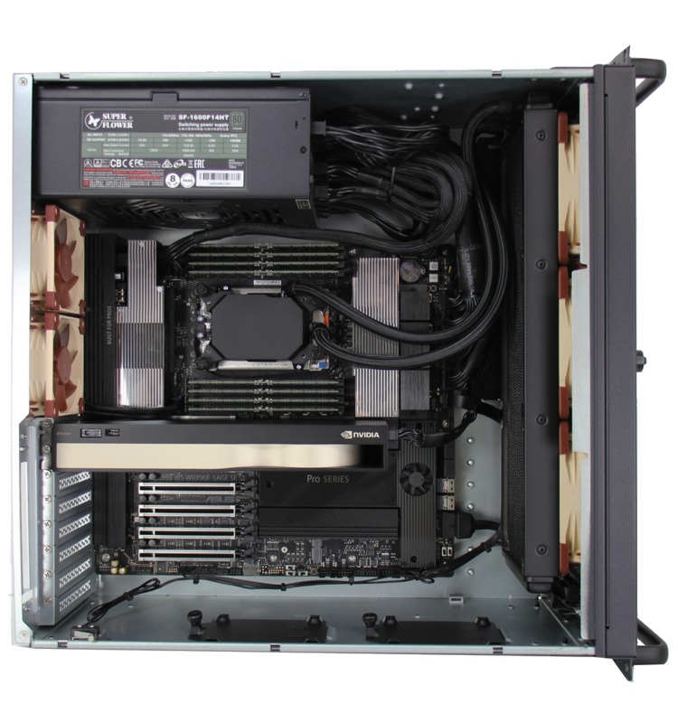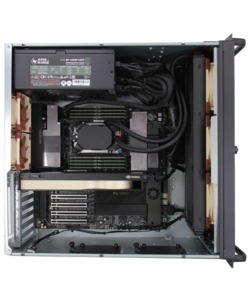 AMD’s Threadripper PRO 7000WX and 9000WX are ideal for applications which need both a lot of cores and high memory capacity / bandwidth. This system is built in a 4U chassis with three USB ports on the front, including one Type C, while the motherboard’s rear I/O panel provides the bulk of the connectivity (more USB, audio, and networking). Internally there is a lot of space, supporting a wide range of options including up to three video cards, up to 1TB of DDR5 memory, and multiple solid-state and hard drive configurations. There are also powerful fans to ensure everything stays well cooled, but without the noise-dampening features a tower workstation can offer.