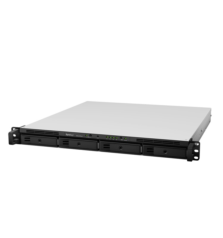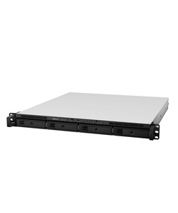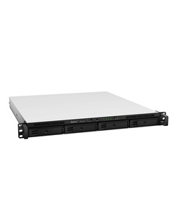 This 1U rackmount network-attached storage system from Synology supports up to four 3.5-inch hard drives (HDDs) in a variety of RAID modes for redundancy and increased performance. It can connect to your network via multiple built-in 1GbE ports or additional networking via an optional add-on NIC.